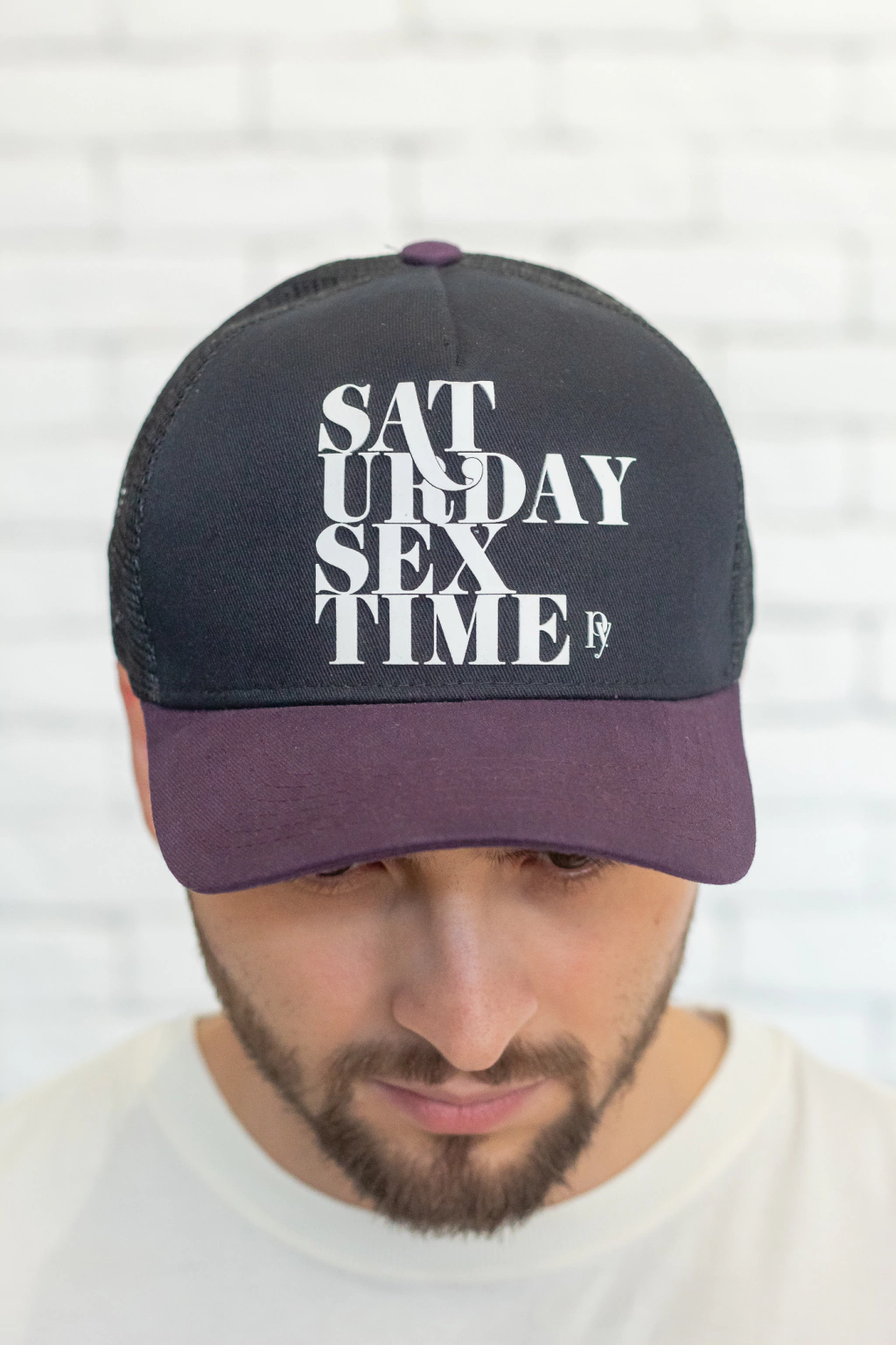 O boné preto é produzido em lona com estampa em relevo na parte frontal, quatro gomos posteriores em tela respirável, aba curvada na cor roxa e fecho snapback.