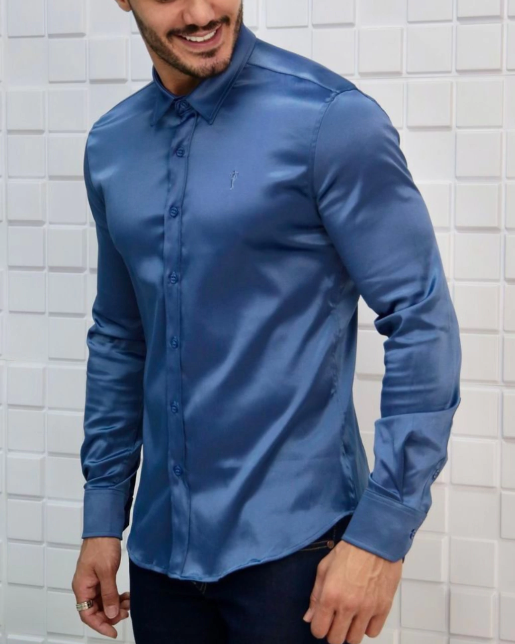 Matéria prima de alta qualidade, fornecedores nacionais e de primeira linha, corte Slim Fit, que tem perfil de roupas mais ajustadas ao corpo, e um ar mais arrojado e moderno. A gola desta camisa é no formato Slim, combinando com gravatas Slim, e nós de menor volume.