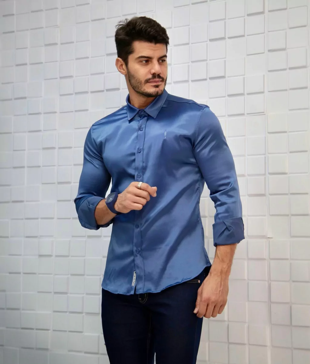 CAMISA SOCIAL ZIP OFF AZUL MARINHO ACETINADA com ELASTANO