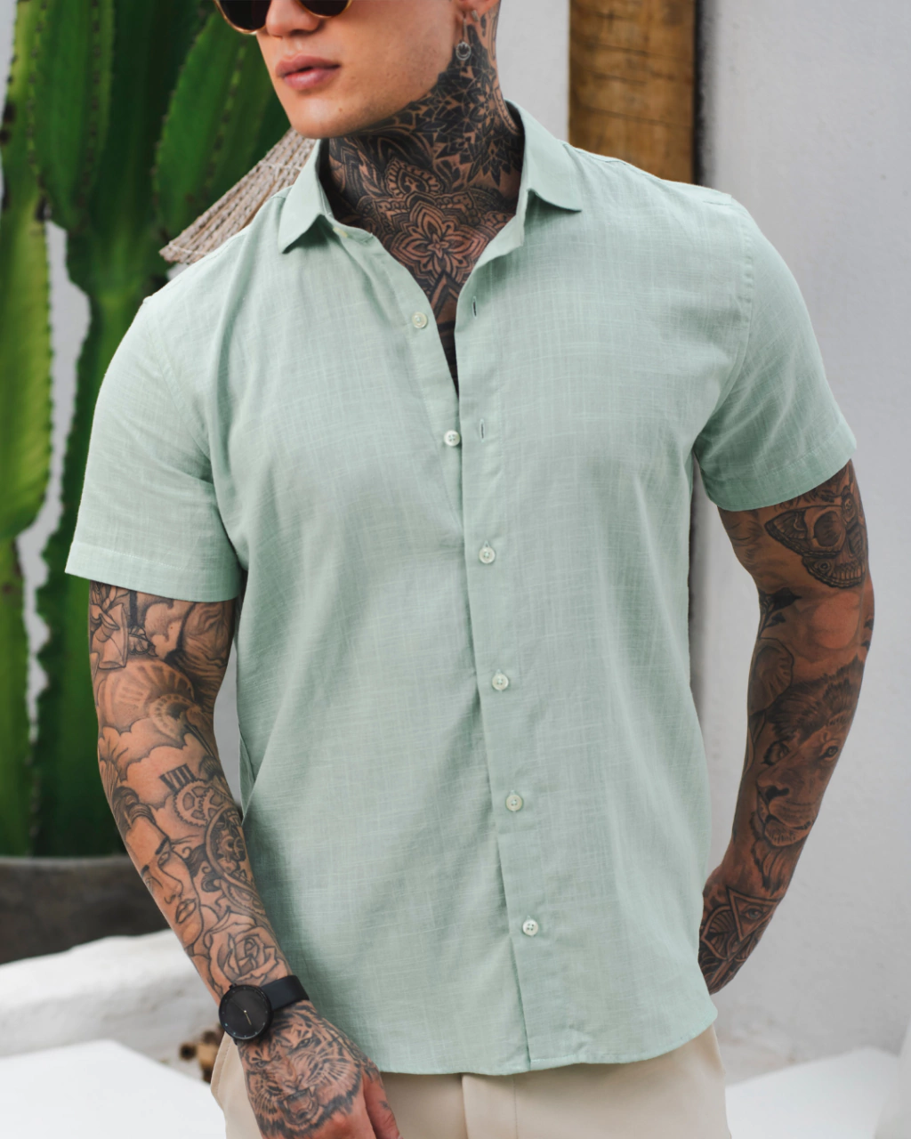 Camisa 100% Algodão Flamê, tecido rústico que se assemelha ao linho, modelagem slim, gola italiana, manga curta com abotoamento frontal.