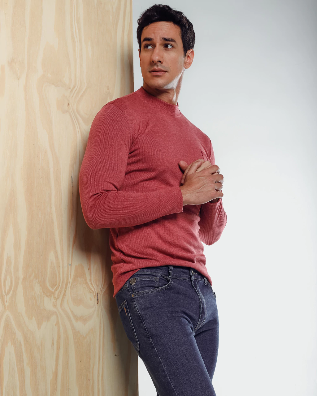 - Com gola alta, esta peça feita em moletim é muito confortável e atemporal. Muito versátil, vai bem com tudo.