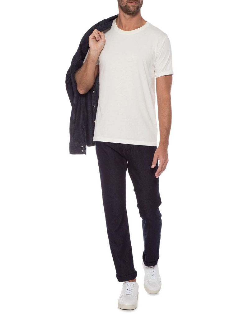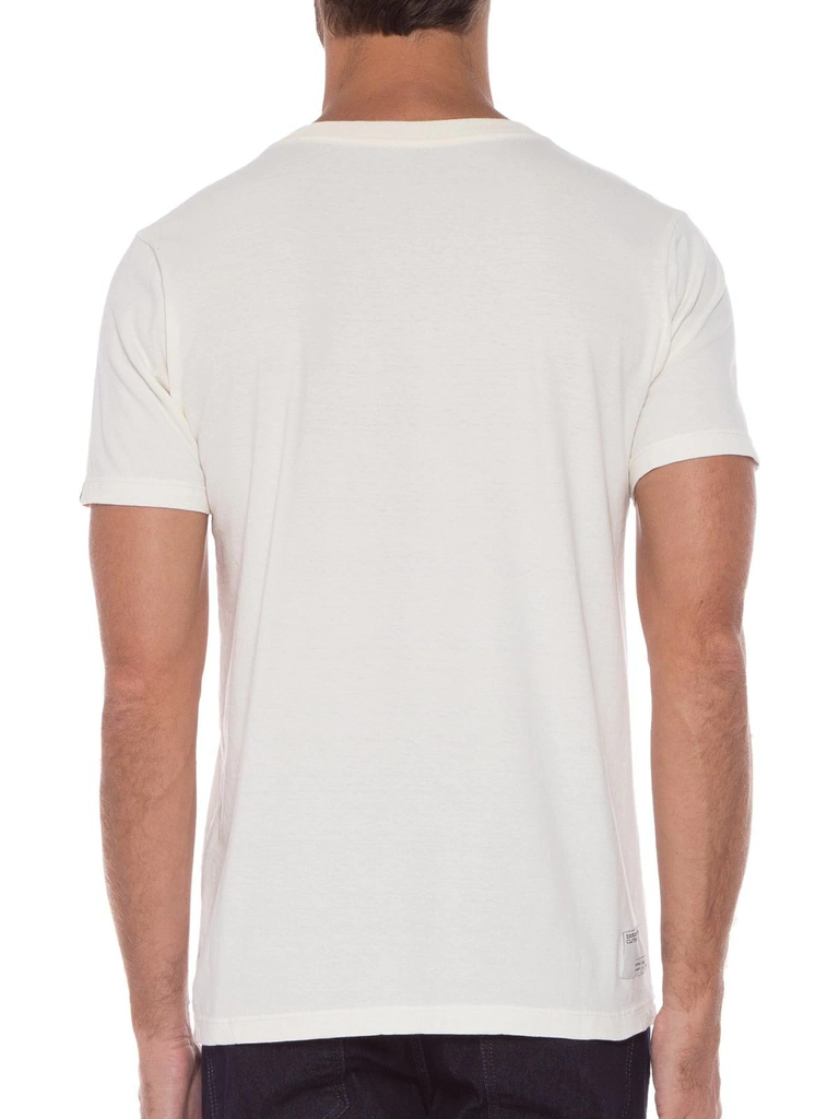 A camiseta branca é confeccionada em malha de algodão. A peça possui gola careca com acabamento canelado, mangas curtas, tag da marca aplicada na manga direita, shape solto, caimento reto e acabamento pespontado.